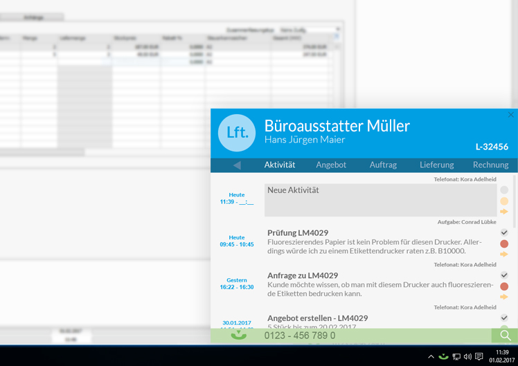 Erkennen Sie sofort welcher Geschäftspartner anruft und zeigen Sie sich den passenden Beleg oder die Aktivitäten an.